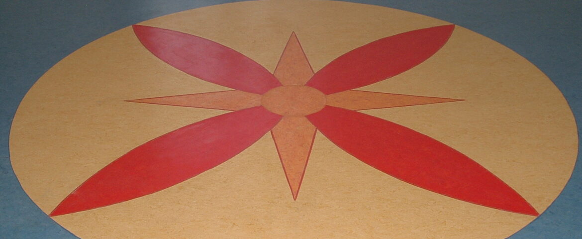 Phase 3 – Finalisation de l’incrustation en linoléum (photo 3) : La dernière étape a été la mise en place de l’incrustation, un magnifique motif en forme d’étoile, utilisant des couleurs contrastées pour créer un point focal attrayant sur le sol. Cette incrustation ne sert pas seulement d’élément décoratif mais aide également à diriger le flux de circulation dans l’espace, offrant ainsi à la fois esthétique et fonctionnalité.